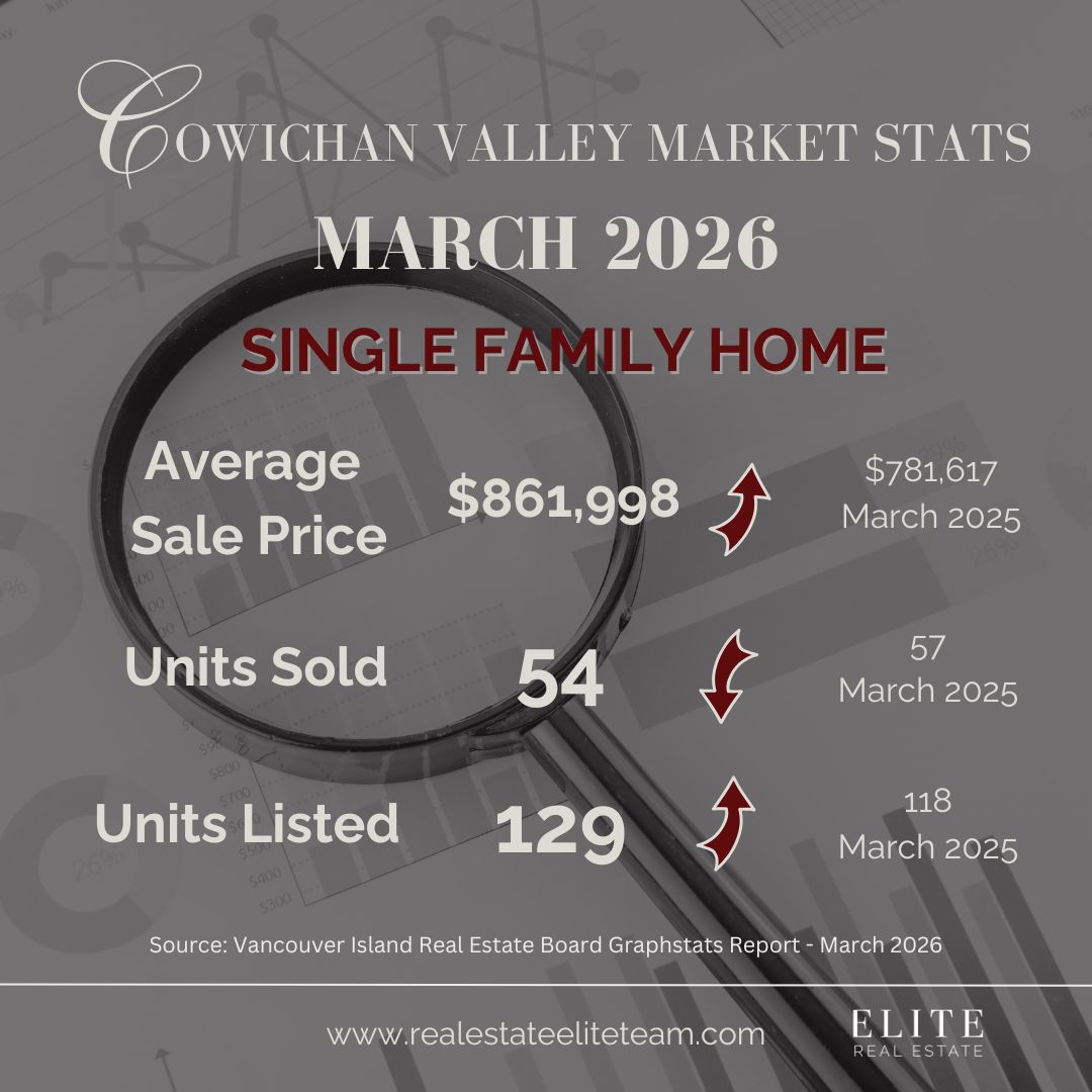 Vancouver Island Real Estate Board's board-wide benchmark price was $780,500 thru March 2026, essentially unchanged from a year ago. Our Cowichan Valley benchmark thru March was recorded at $765,200, down 2% from March of last year.. For a closer look at our stats for all types of real estate here in the Cowichan Valley, over the last 12 months to date:
