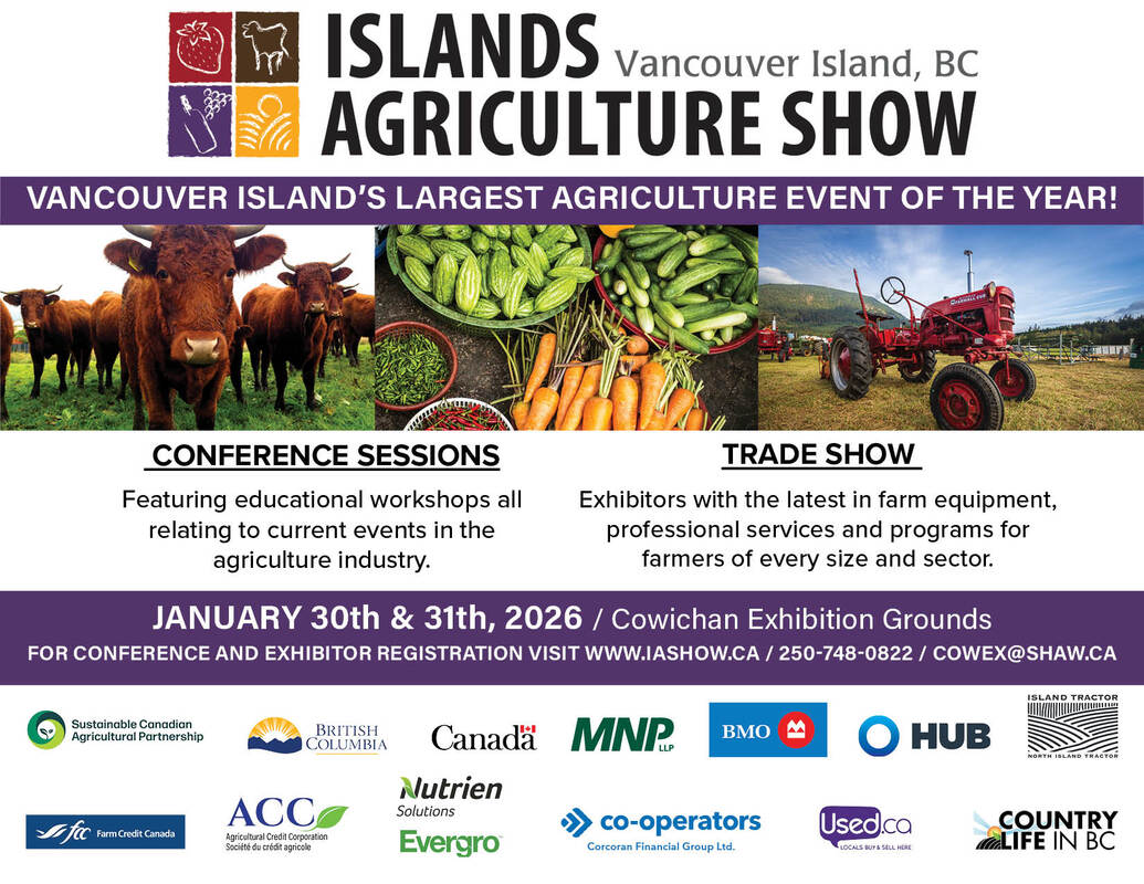 | | | Friday, January 30 Saturday, January 31 | Islands Agricultural Show Vancouver Island's premier agricultural event returns with 2 full days of education, innovation and connection with farmers & producers. Workshops and trade shows, students are Free on Friday. Get more info at iashow.ca Cowichan Exhibition Grounds 7380 Trans Canada Hwy, Duncan |