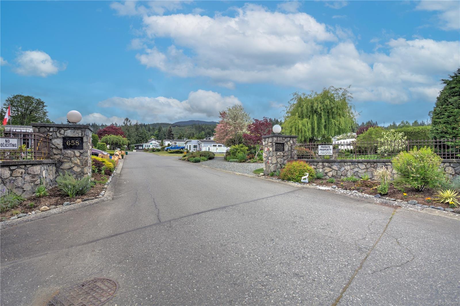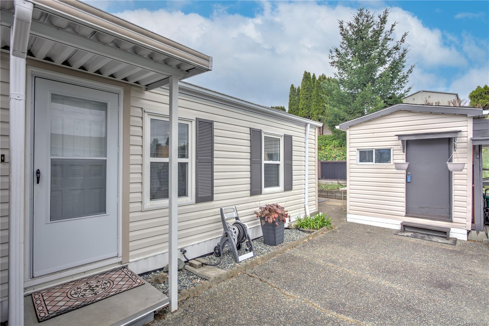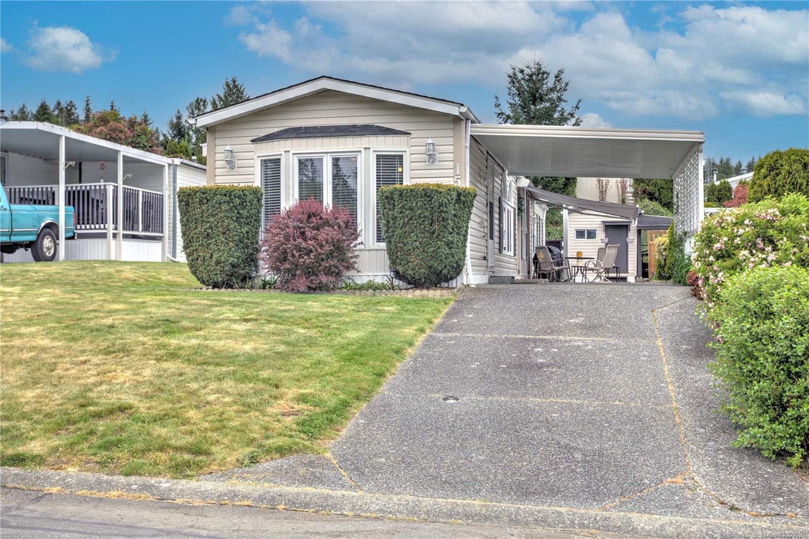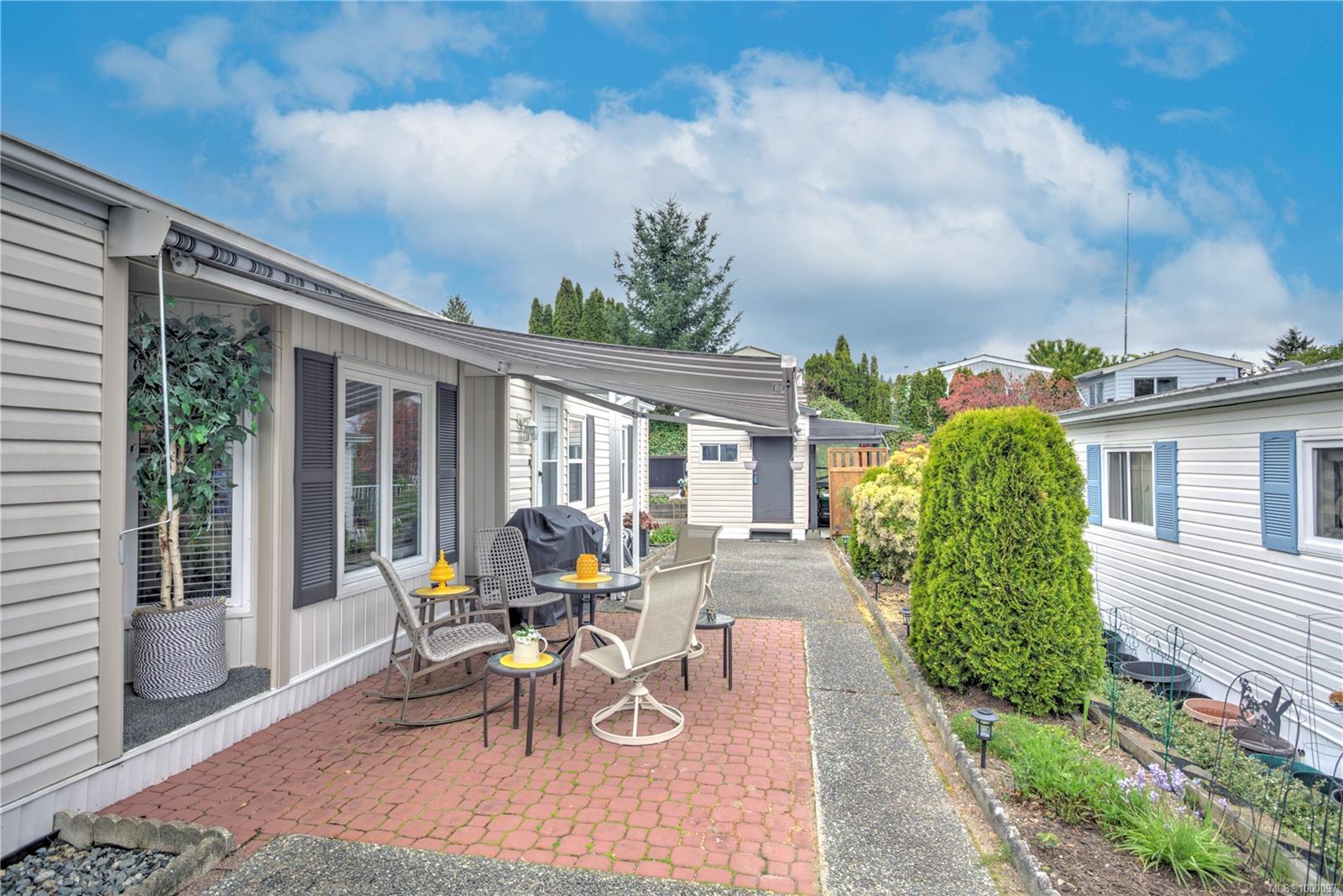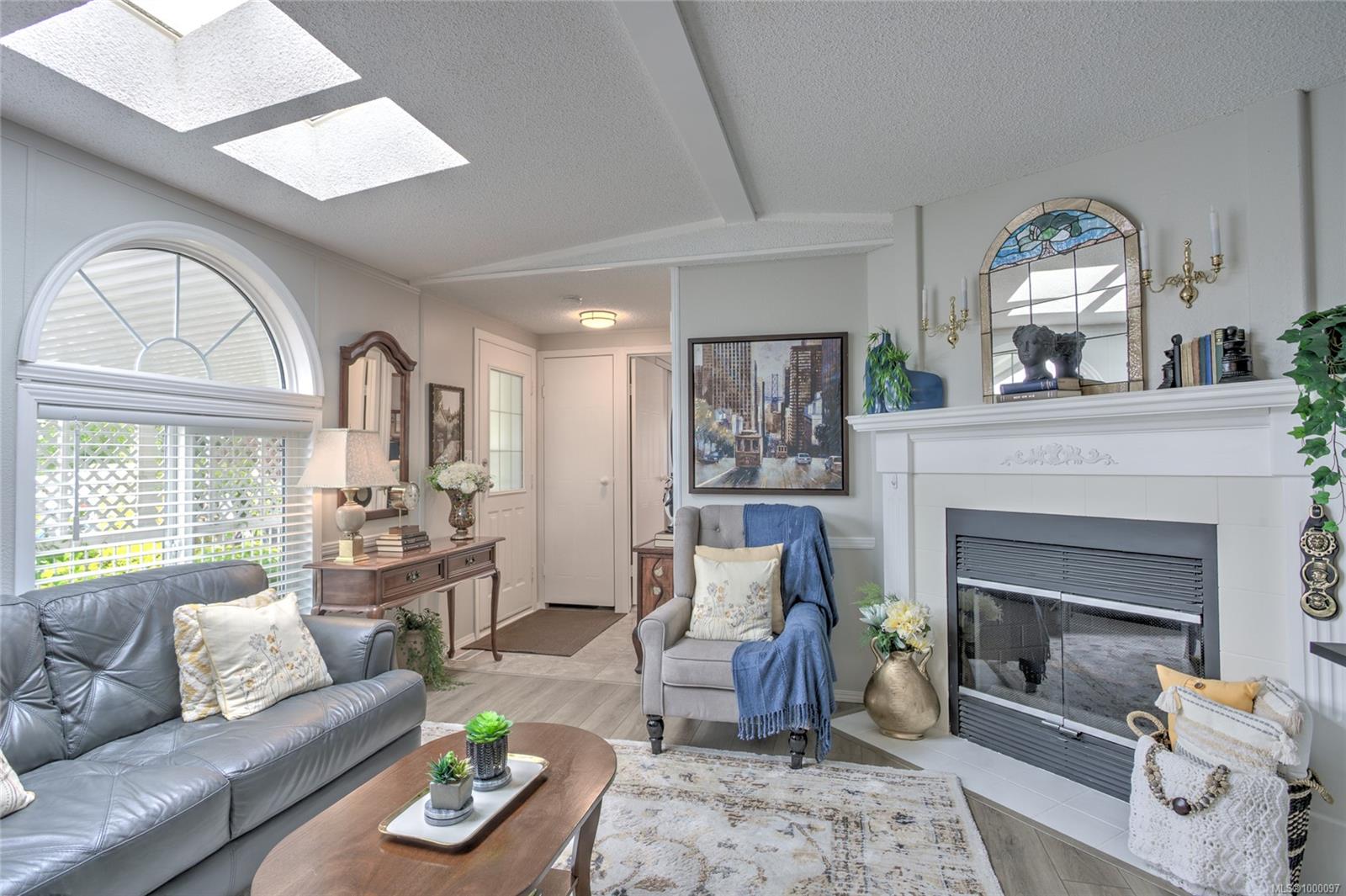 Welcome to Rocky Creek Village, arguably one of the nicest parks in the Cowichan Valley! And, as a former show suite, this 2 bedroom, 2 bathroom home is one of the nicest in the park! The bright, open concept main living area features generous windows and skylights throughout, a spacious kitchen with stainless steel appliances, lots of cupboard space and bay eating area, living room with cozy gas fireplace and easy access to the patio with retractable awning, perfect for BBQs and a shady retreat when needed. The well laid out plan situates bedrooms at either end of the unit, creating ample privacy for owners and guests. The primary bedroom includes a generous ensuite complete with separate shower and soaker tub. Covered parking in the attached carport, detached storage shed for your tools and hobbies, low maintenance landscaping, upgraded pex plumbing throughout and a new gas hot water tank installed in 2025 too! Come explore easy retirement living in this desirable 55+ community!
