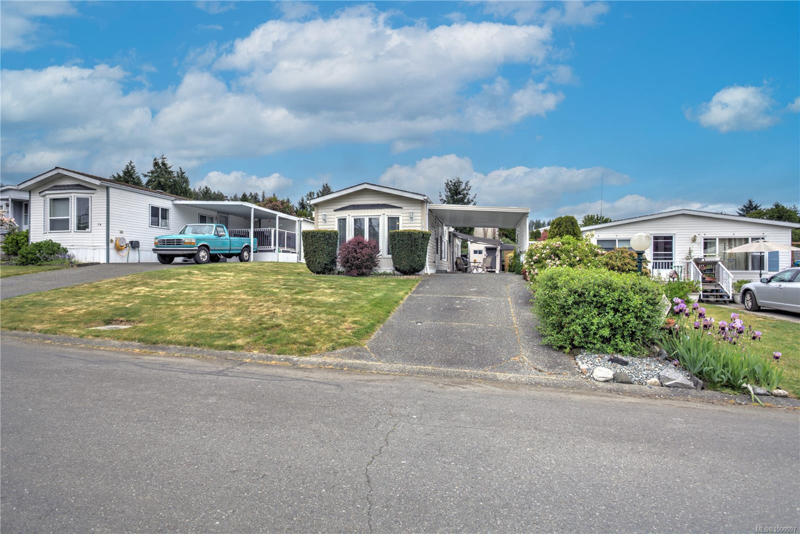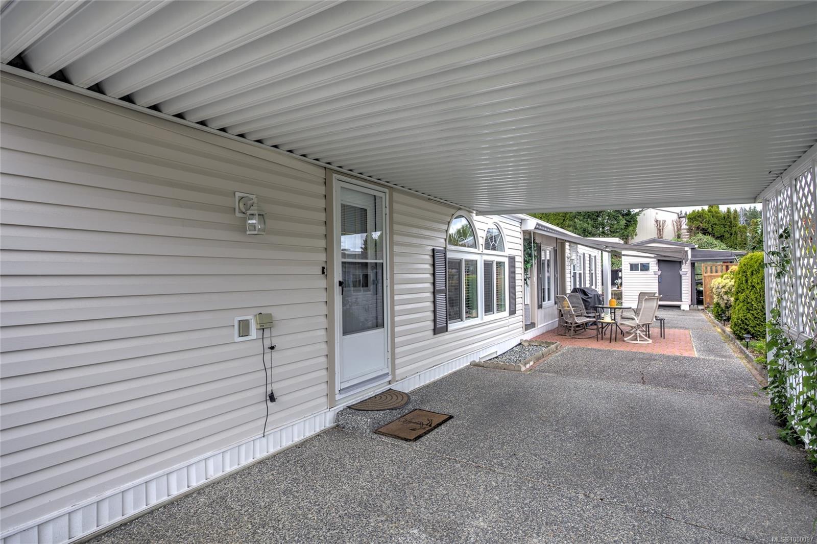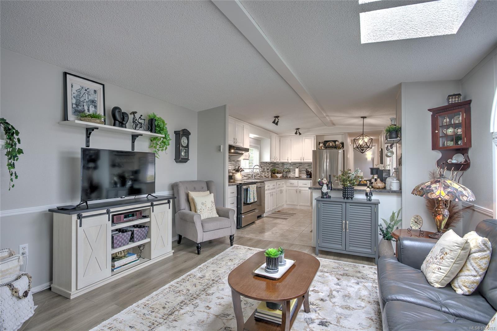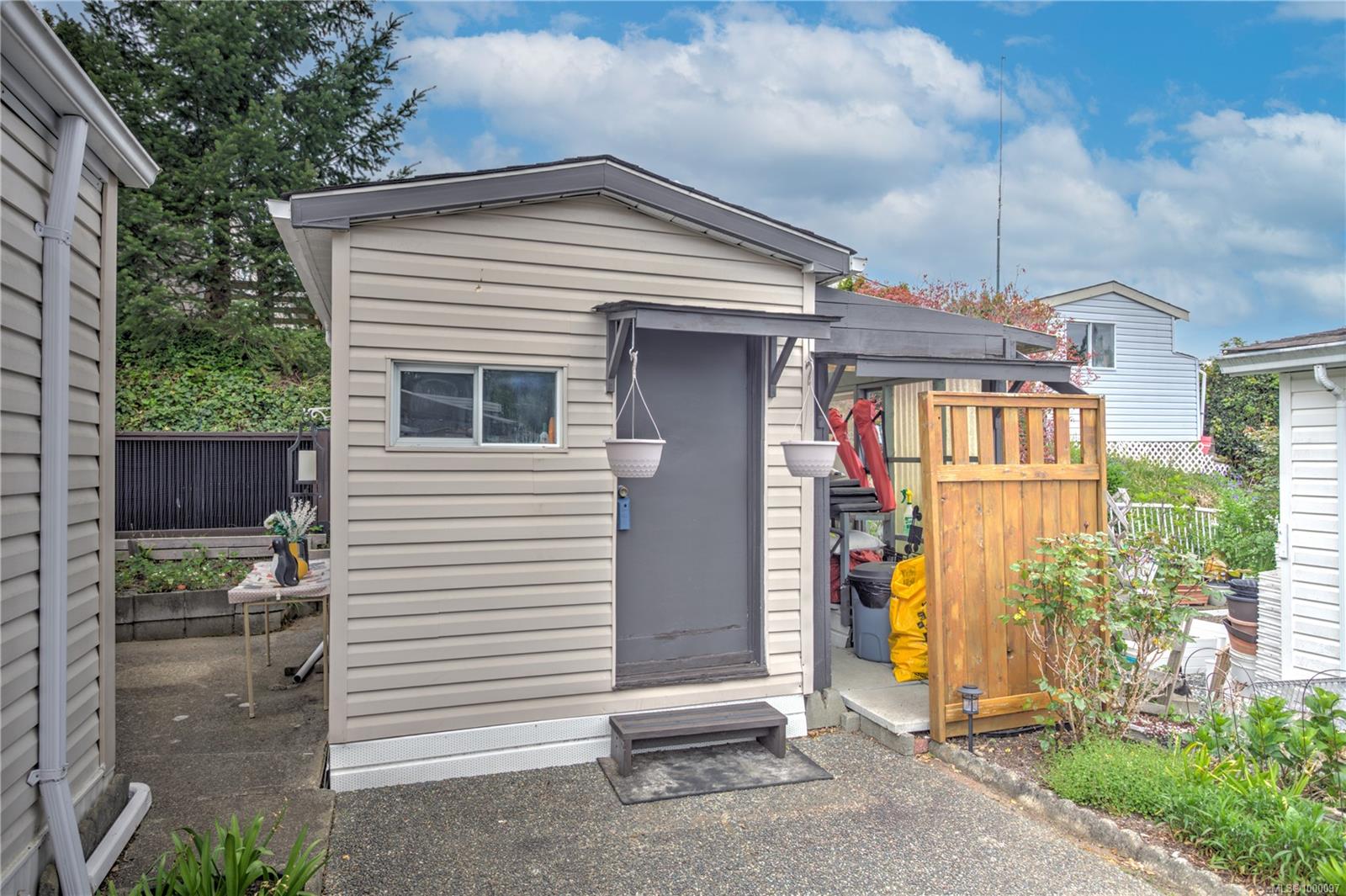 Welcome to Rocky Creek Village, arguably one of the nicest parks in the Cowichan Valley! And, as a former show suite, this 2 bedroom, 2 bathroom home is one of the nicest in the park! The bright, open concept main living area features generous windows and skylights throughout, a spacious kitchen with stainless steel appliances, lots of cupboard space and bay eating area, living room with cozy gas fireplace and easy access to the patio with retractable awning, perfect for BBQs and a shady retreat when needed. The well laid out plan situates bedrooms at either end of the unit, creating ample privacy for owners and guests. The primary bedroom includes a generous ensuite complete with separate shower and soaker tub. Covered parking in the attached carport, detached storage shed for your tools and hobbies, low maintenance landscaping, upgraded pex plumbing throughout and a new gas hot water tank installed in 2025 too! Come explore easy retirement living in this desirable 55+ community!