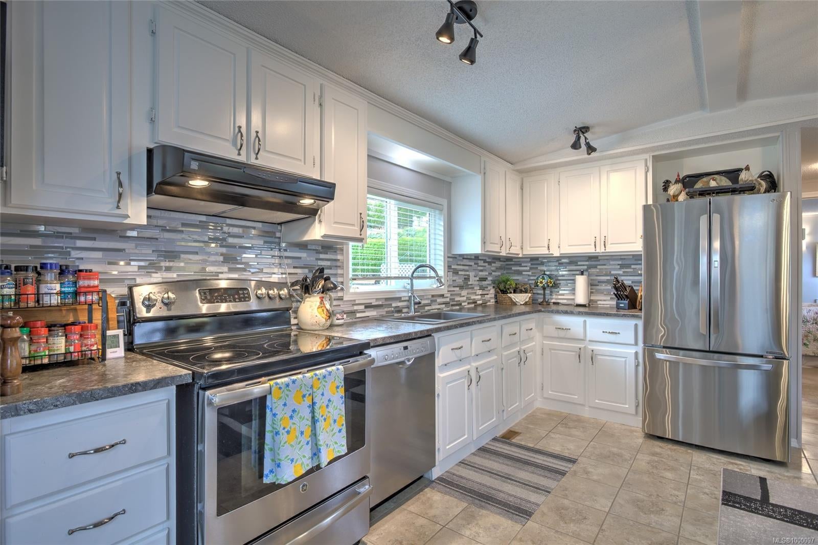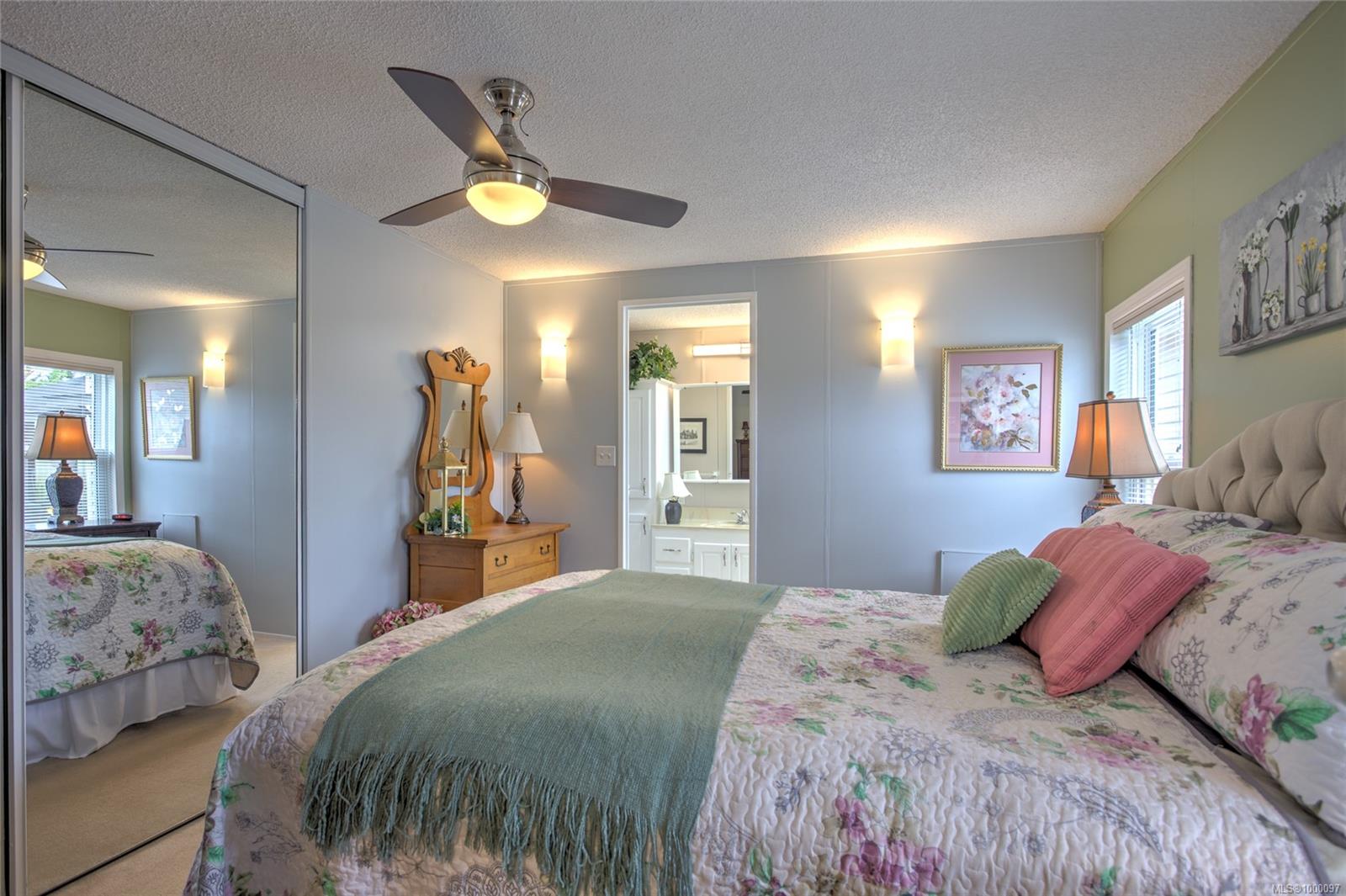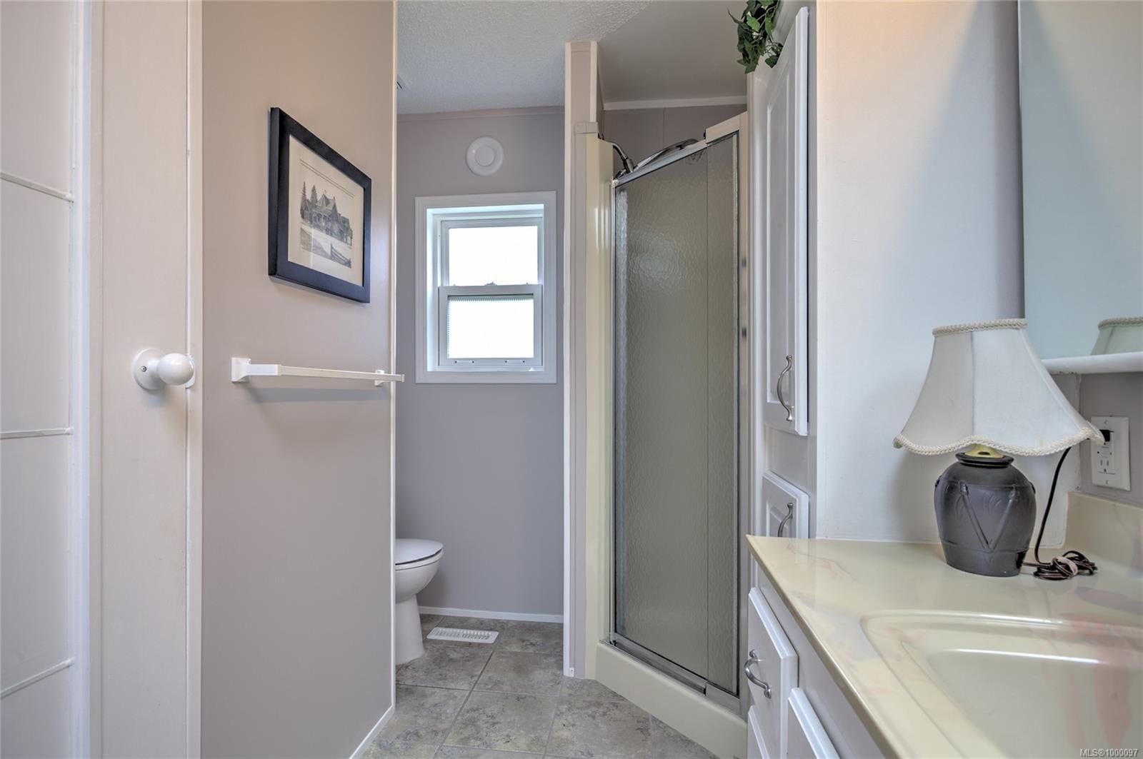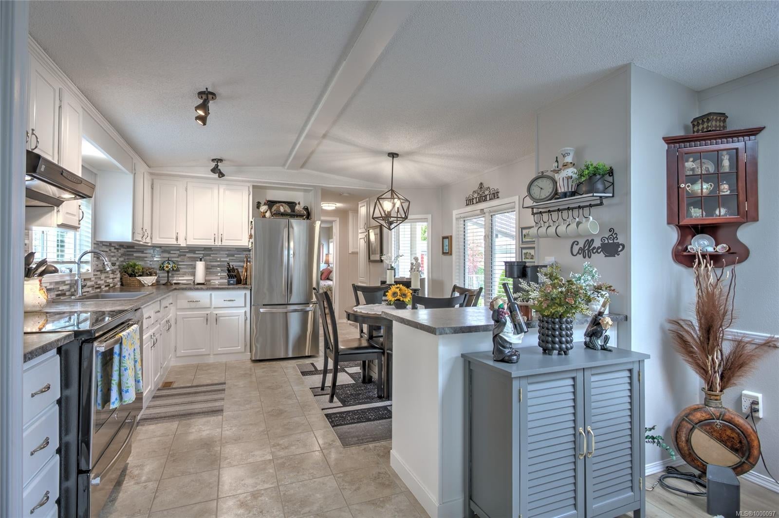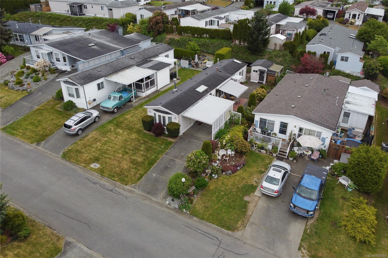 Welcome to Rocky Creek Village, arguably one of the nicest parks in the Cowichan Valley! And, as a former show suite, this 2 bedroom, 2 bathroom home is one of the nicest in the park! The bright, open concept main living area features generous windows and skylights throughout, a spacious kitchen with stainless steel appliances, lots of cupboard space and bay eating area, living room with cozy gas fireplace and easy access to the patio with retractable awning, perfect for BBQs and a shady retreat when needed. The well laid out plan situates bedrooms at either end of the unit, creating ample privacy for owners and guests. The primary bedroom includes a generous ensuite complete with separate shower and soaker tub. Covered parking in the attached carport, detached storage shed for your tools and hobbies, low maintenance landscaping, upgraded pex plumbing throughout and a new gas hot water tank installed in 2025 too! Come explore easy retirement living in this desirable 55+ community!