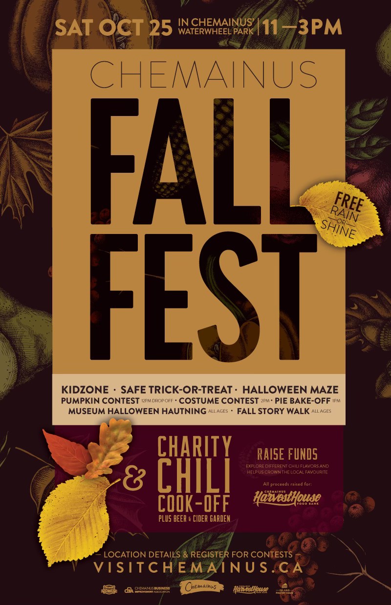 Sat, October 25th | Chemainus Fall Fest & Chili Cookoff Delicious treats, a charity chili cook-off, kidszone, and so much more. Come celebrate fall - rain or shine! Free Event!