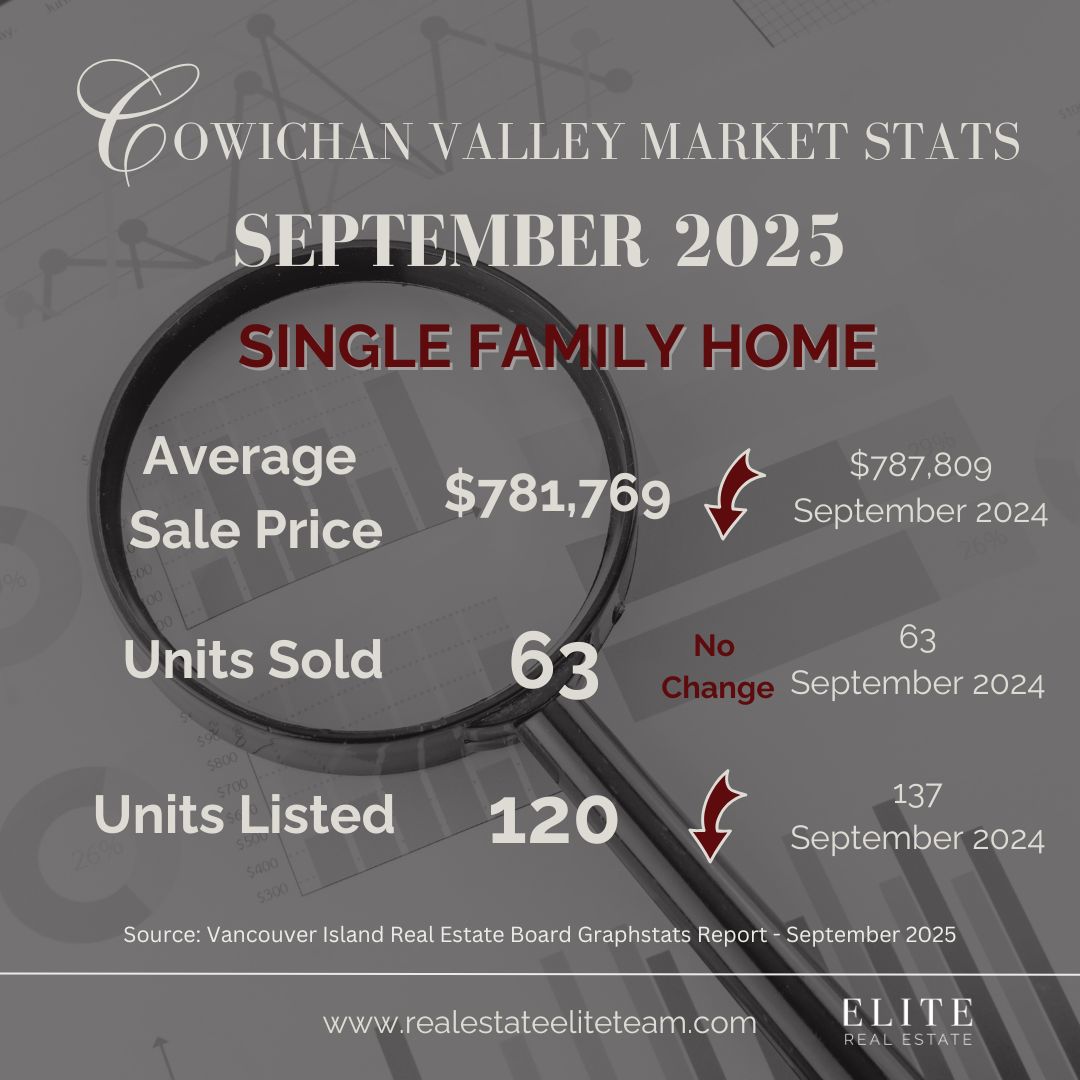 The Cowichan Valley benchmark price for a Single Family Home thru September 2025 was up four per cent over September 2024, currently at $804100, while the Vancouver Island Real Estate Board's board-wide benchmark dropped two percent, to $796,000. For a closer look at our stats for all types of real estate here in the Cowichan Valley, over the last 12 months to date: