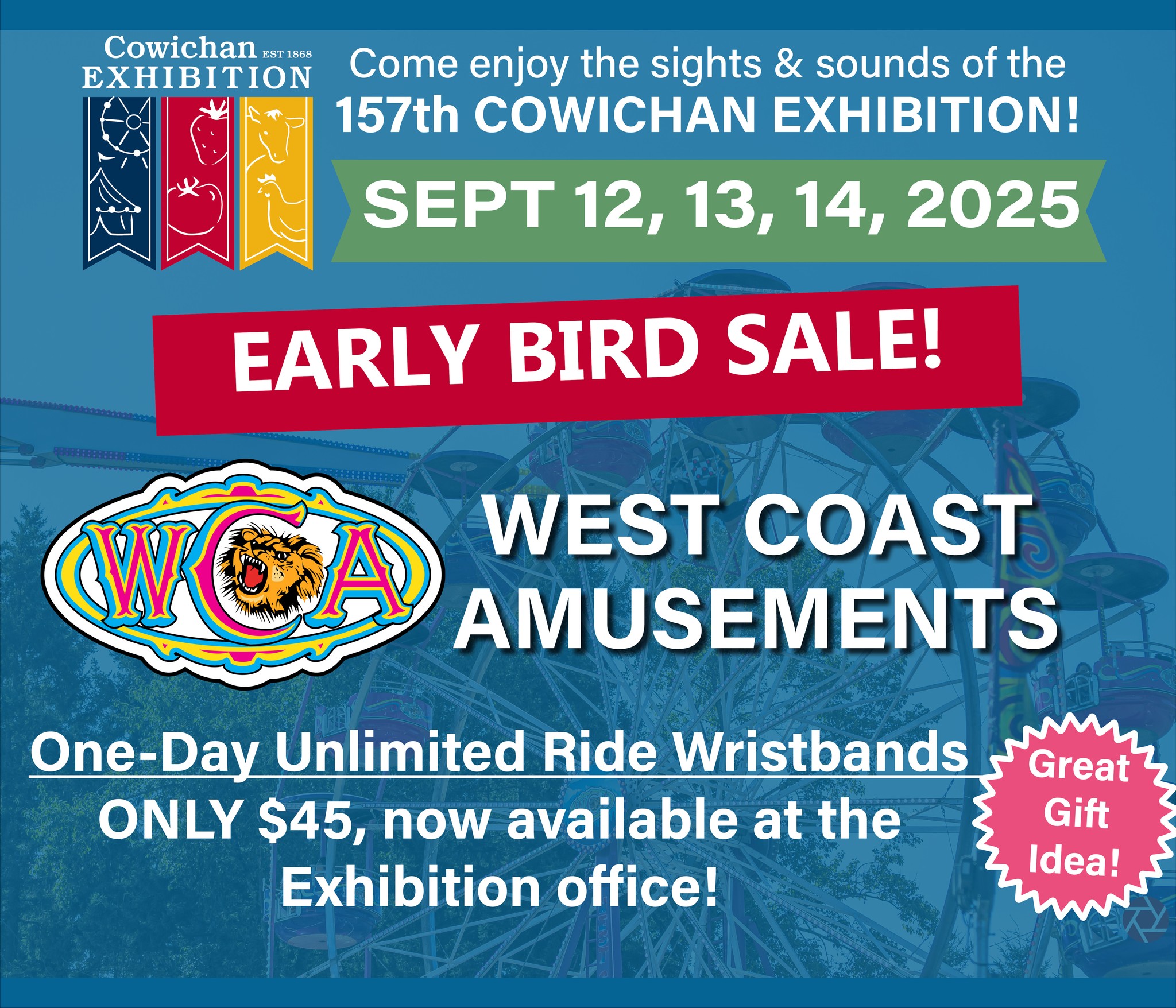 September 12th -14th | 157th Annual Cowichan Exhibition Fall Fair! 3 days - 100s of exhibitors, food, entertainment, livestock, displays, games, rides - too much to see and do to list here! Get more info and advanced tickets at cowex.ca/the-fair Cowichan Exhibition Grounds 7380 Trans Canada Hwy Duncan |