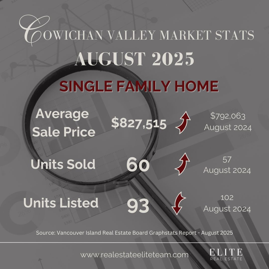 The Cowichan Valley benchmark price for a Single Family Home thru August 2025 was up two per cent over August 2024 at $769,900, matching the Vancouver Island Real Estate Board's board-wide benchmark . For a closer look at our stats for all types of real estate here in the Cowichan Valley, over the last 12 months to date: