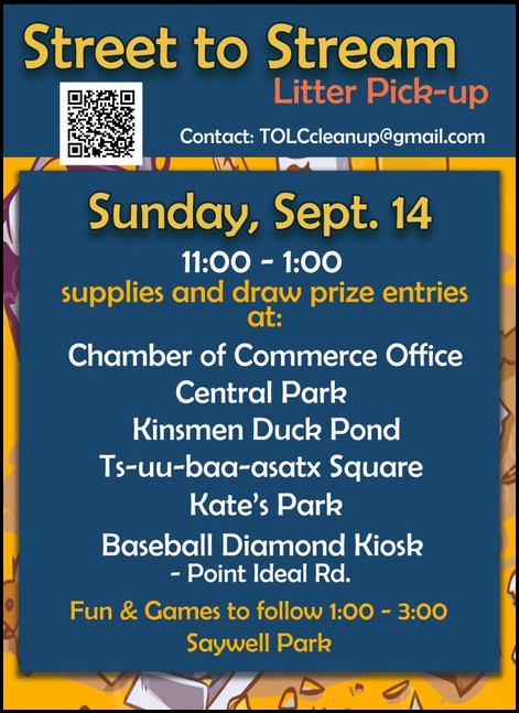 Sun, September 14 11:00-1:00 | Celebrate World Clean Up Day by joining the Cowichan Lake & River Stewardship Society and the Town of Lake Cowichan's "Street to Stream Litter Pick Up" Saywell Park Lake Cowichan |